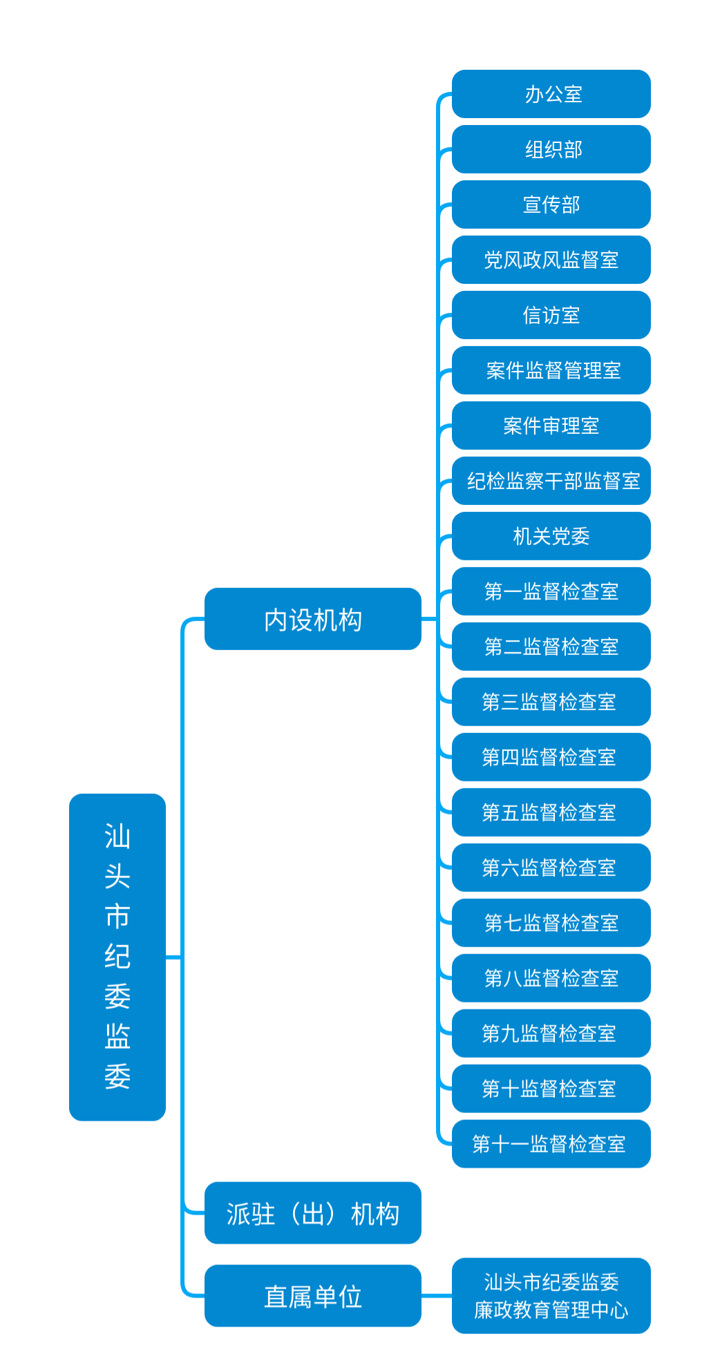 内设职能部门具体为:办公室、组织部、宣传部、党风政风监督室、信访室、案件监督管理室、第一监督检查室至第五监督检查室、第六审查调查室至第十一审查调查室、案件审理室、纪检监察干部监督室、机关党委。